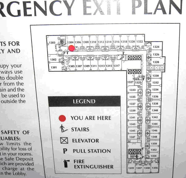 På Hilton hotell i Austin i Texas fann jag 2007 denna utrymningsplan på insidan min hotellrumsdörr. Tydligen hade alla rum på mitt våningsplan samma skylt, med den skillnaden att den röda "you-are-here"-pricken var placerad olika beroende på i vilket rum skylten var. I mitt fall så innebar planens orientering att närmaste nödutgång var trappan strax till vänster om mitt rum. Så åt vilket håll skulle jag behöva springa när jag öppnat min dörr? Jo, till höger. Många människor har svårt med den här typen av mentala rotationer. I en främmande stad kan vi lösa det genom att vända kartan upp-och-ner, men den här planen satt fastskruvad på dörren. Och hur skulle vi reagera om vi väcktes mitt i natten av brandlarm och stickande rök? Forskning visar att vid livsfara så tar mer primitiva funktioner i hjärnstammen över från normalt komplexa kognitiva hjärnfunktioner (Science, 2007). Det är osäkert om alla människor i en nödsituation skulle klara av den mentala rotation nödvändig för att hitta närmaste nödutgång med hjälp av utrymningsplanen.